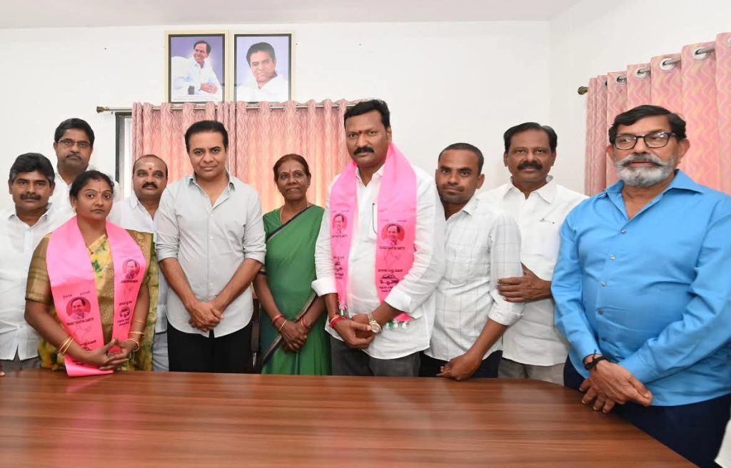 RSD-Sircilla news: Ahead of the municipal elections, Dudam Rajani Srinivas, a leader from the sixth ward of the Sircilla town Congress, joined the BRS party at Telangana Bhavan in Sircilla in the presence of KTR. KTR welcomed Dudam Rajani Srinivas and his followers into the party by presenting them with the pink scarf. Congress leader Boora Balu from the first ward also joined the BRS along with a large number of his followers. KTR welcomed them into the party by presenting them with the party scarf. Along with KTR, Municipal Elections In-charge Thula Uma, BRS District President Thota Agayya, former KDCCB Chairman Konduru Ravinder Rao, Town President Jindam Chakrapani, state leader Cheeti Narsing Rao, ZP Vice Chairman Siddam Venu, and several other leaders participated in the program.