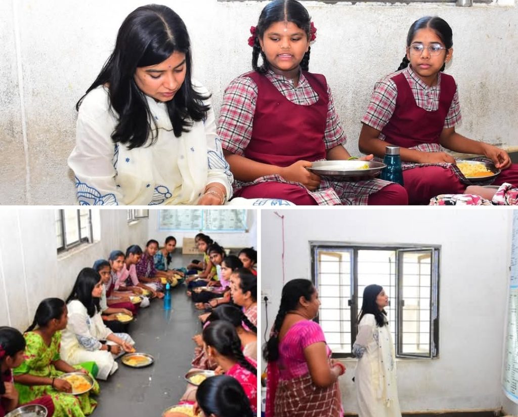 RSD-Sircilla news: District Collector Garima Agrawal conducted a surprise inspection of Kasturba Gandhi Balika Vidyalaya (KGBV) at Peddur under Siricilla Municipal limits on 10.04.2026. As it was time to serve breakfast to the students in the morning, the District Collector first examined the menu chart. She went straight to the dining room and took a plate and had tiffin with the students. She inquired whether meals and other food items were being served as per the menu. She asked how they were preparing for the annual exams. District Collector Garima Agrawal gave suggestions to the students on reading, writing, planning and other topics. She wished them to study well and achieve good results in the exams.