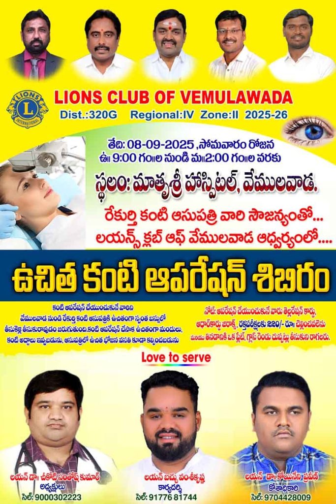 RSD- Vemulawada news: With the courtesy of Rekurthi Eye Hospital, a free eye operation camp will be organized on 08.09.2025, under the Lions Club of Vemulawada. Arrangements are being made to this effect at Matrushree Hospital in Vemulawada town. The camp will be organized from 09.00 am to 02.00 pm on 08.09.2025. Those who want to get the operation should bring a white ration card, Aadhaar card xerox copies, and Rs. 220 for the blood test. They can bring a plate, glass, and two blankets to stay. Free food and accommodation will be provided. Those undergoing eye surgery will be taken from Vemulawada to Rekurthi Eye Hospital and brought back free of cost by bus. After the operation, medicines and eyeglasses will be given free of cost. DR. Santosh Kumar, President of Lions Club Vemulawada, has requested those undergoing eye surgery to make the most of this camp. They should bring the required documents along. For complete details, contact phone numbers DR. Santosh Kumar 90003 02223, Lion Bachchu Vamsi Krishna 91776 81744, Lion DR. Koineni Praveen 97044 28009.