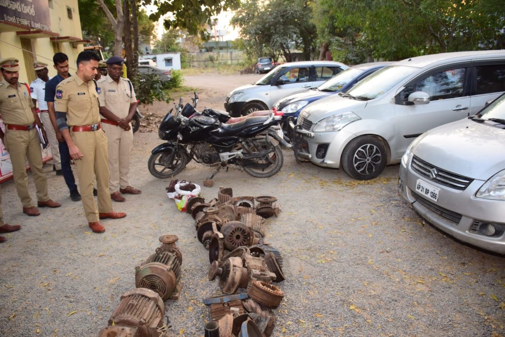 Similarly in the second week of January 2024, 5 current motors in a well in Vemulawada Ayyorupalli village, Nagayya Palli, Vemulavada Rural Zone ,Vilasnagar , Chandurthi Mandalam Jogapur Mandal village, Boyanapalli Mandalam Vilasnagar village in the suburbs of Nukkalamarri in the first week of February 2024, in the village of Chekkapalli ,in the village of Vattenla . Near the pond bundle in the suburbs of Nagayya Palli village, in the village suburb of Venkatampally in the suburbs in the agricultural land in five cars. In order to go to Kamareddy to sell them. On 16-02-2024 on suspicion of the police the cars in the suburbs of Marripalli village were stopped by Vemulavada Rural Police and checked, a total of Rs. 4,78,000/-worth 33 motors were found. The SP said that the 05 cars, 2 two wheelers, four cell phones and 33 motors were seized and the thieves were taken to remand.