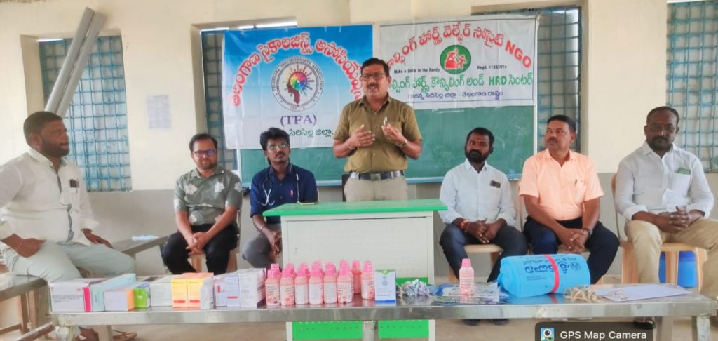 RSD- Sircilla news: A free health camp was organized on 26.04.2026 in Rajiv Nagar, Rajanna Sircilla District, under the aegis of the voluntary organization ‘Helping Hearts Welfare Society,’ and courtesy of Shivani Hospitals, Sircilla. During this medical camp, medical services were provided by Dr. Karthikeyan (MD, Pulmonologist), Dr. Shivaramakrishna (Dental Specialist), and K. Punnamchander (Psychologist). A large number of local residents participated in the camp, underwent medical examinations, and availed themselves of the free medical services. Speaking on the occasion, Dr. Karthikeyan, a specialist in chest and lung diseases, stated that respiratory-related ailments are on the rise in current times due to changing lifestyles, pollution, smoking, and unhealthy habits. He advised people not to ignore symptoms such as difficulty breathing, coughing, and fatigue, but to consult a doctor immediately. He further noted that serious diseases can be detected early and prevented by undergoing regular health check-ups. Dental specialist Dr. Shivaramakrishna emphasized that dental health is equally crucial for overall physical well-being. He advised maintaining dental hygiene and urged both children and adults to cultivate greater awareness regarding dental care. Renowned psychologist K. Punnamchander remarked that, alongside physical health, it is equally essential to safeguard one’s mental health. It was noted that in contemporary society, mental health issues are on the rise due to stress, anxiety, insomnia, family problems, and various addictions; consequently, it was suggested that individuals facing such circumstances should avail themselves of counseling and mental health services. It was emphasized that both physical and mental well-being are essential for building a healthy society. During the camp, medical screenings were conducted for the public to check for blood pressure, diabetes, respiratory issues, and dental problems; free medicines were distributed to those in need. Medical experts offered health advice to the attendees and raised awareness regarding topics such as maintaining a healthy diet, engaging in regular exercise, and abstaining from harmful habits. Speaking on the occasion, Aluvala Eshwar, President of ‘Helping Hearts,’ stated that they would continue to organize such free health camps regularly to ensure that healthcare services remain accessible to the public. Ward Councilor Mamidala Mahesh urged the public to make the best use of such camps and to pay greater attention to safeguarding their health. The event was attended by Aluvala Eshwar (President of the ‘Helping Hearts Welfare Society’ NGO), Psychologist Punnamchander, Ward Councilor Mamidala Mahesh, Elagonda Anjaneyulu, Anthadpula Ramu, Srinivas, Gadde Prakash, medical staff, and others. Local residents appreciated the initiative and requested that such community service programs be organized frequently.