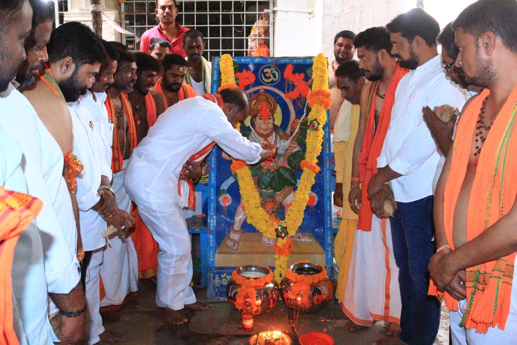 RSD- Vemulawada news: Government Whip and Vemulawada Legislators Adi Srinivas participated in the Sri Hanuman Shobha Yatra organized by Hanuman Seva Samiti from the temple of Sri Nagareswara Swamy in Vemulawada town to celebrate Hanuman Pedda Jayanti. People of all sections prayed to be happy with good health and timely rains,dairy and crops. They were accompanied by Municipal Vice Chairman Bingi Mahesh, leaders of Sangha Swami Yadav, Chiluka Ramesh, Kanikarapu Rakesh, Namala Lakshmi Raju, Pulkam Raju, Dadi Mallesham, and Hanuman devotees.