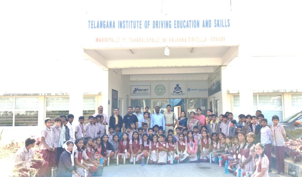 RSD-Sircilla news: Sixth-grade students from the local Zilla Parishad High School (Girls), Sircilla, visited the International Driving Training School (IDTR) in Sircilla town as part of an educational tour under the PM Shri program.On this occasion, the driving school staff explained to the students in detail about road safety rules, the importance of traffic signals, and the precautions to be taken while driving vehicles. They also provided practical awareness on topics such as the use of helmets and seat belts, and the prevention of road accidents.The teachers stated that this visit increased awareness among the students regarding road safety and instilled in them the understanding of becoming responsible citizens in the future. The school management stated that this program was very useful and informative for the students.The tour was inaugurated by District Collector Garima Agarwal and DEO Vinod, who attended as chief guests and flagged off the event. Headmistress Sharada and teachers Tirupati, Swapna, Bhupal Reddy, Suresh, Renuka, and Prabhakar participated in this program.Also K. Venkanna (ASC, DEO Office, Sircilla), Ch. Padmaja (GECO, DEO Office), V. Shailaja (Quality Coordinator, DEO Office), and Principal of IDTR. Durai Murugan, Trainers K. Manohar and G. Sirisha, Admin Executive, Prithvi (AMVI, Sircilla) were present at the event. All of them participated and provided valuable information to the students.