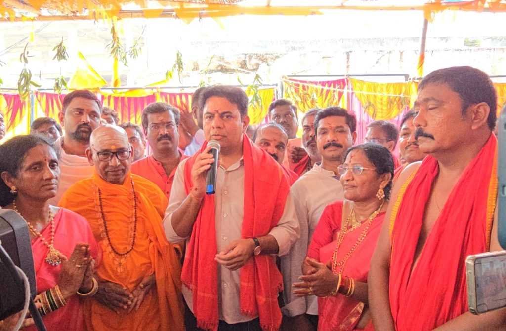 RSD- Sircilla news:  BRS Working President and legislator of Sircilla KTR said that he wants the hardships in the textile industry of Sircilla to be removed. On 18.08.2024, KTR participated in the Chandi Mahayagam at Sri Shiva Bhakta Markandeya Swamy Temple and performed special pujas. On this occasion, he said that in the past he had given his share of help for the construction of the Markandeya Swamy temple and said that he would give more help in the coming days. He  said that it is God’s wish that the crises in the textile industry should be removed and everyone should be prosperous. Goli Venkataramana, town president of Padmasali Sangam, Jindam Chakrapani, Bolli Rammohan, BRS town presidents and many leaders of Padmasali, priests participated in the programme.